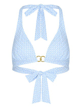 Striking, sculpting, and endlessly flattering, the Elba Bikini Top in Blue Geo Print with gold foil brings a touch of luminous elegance to your swim wardrobe. This classic built-up triangle features wider halter straps that not only offer exceptional comfort but also create a subtle, natural lift. A wide underband provides dependable support for all shapes and sizes, while removable pads allow you to tailor your shape and coverage to suit your style. Finished with gold double-ring trims, Elba adds a refined hint of luxury to every sun-drenched moment.