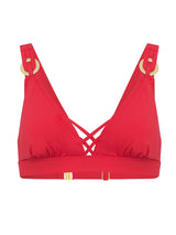 Turn up the heat with the Phoebe Bikini Set in striking Fiery Red. A reimagined take on the classic built-up triangle, this top combines flattering design with maximum comfort. Adjustable straps and a reinforced underband allow for a fully custom fit, while gold ring trims and a centre-back clasp add a touch of luxe detailing. Removable pads provide versatility, giving you the option to tailor your shape and support.